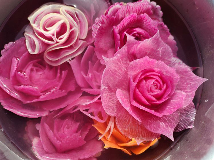 馮昕部長向各位領(lǐng)導(dǎo)細(xì)致的講解渭南西北新世紀(jì)學(xué)校烹飪專業(yè)學(xué)生的雕刻、拼盤以及西點等作品。IcA陜西華山教育集團